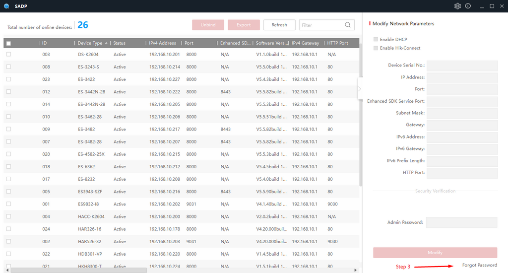 3. Right click the SADP Tool icon on desktop, and run it as Administrator, select the device that needs the password reset, and click “Forgot Password” on the right hand corner of the screen.